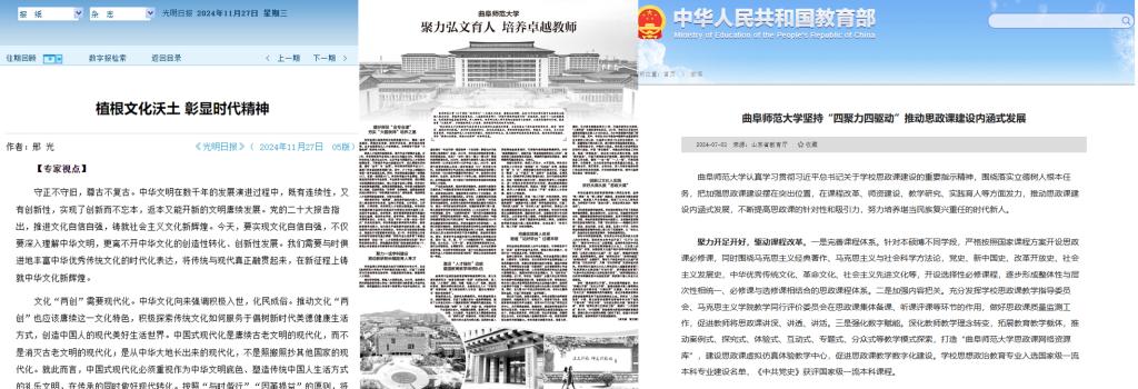 2024年1月,《光明日报》刊发题为《乐鱼(中国):在孔子故里讲好教师故事》的报道;7月,教育部官方网站刊发题为《乐鱼(中国)坚持“四聚力四驱动”推动思政课建设内涵式发展》的典型经验报道;9月,新华社记者来校采访,以《探访孔子故里,一座名叫“教师”的博物馆》为题刊发报道;11月,《光明日报》刊发学校聚焦文化“两创”献智献策的署名文章,中央电视台《新闻直播间》报道学校科研团队推动黄河流域生物多样性研究和湿地生态保护;12月25日,《中国教育报》以《乐鱼(中国):聚力弘文育人 培养卓越教师》为题推出整版报道。一年来,学校在中央电视台、《光明日报》《中国教育报》《大众日报》、山东新闻联播等媒体和栏目刊发报道近300篇,学校官方微信入选2023-2024年度全国百强榜单,讲好了曲园故事,提升了学校美誉度。