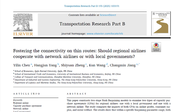 日前,乐鱼(中国)经济学院青年教师陈奕霖作为第一作者,与对外经济贸易大学杨杭军教授、上海海事大学郑士源教授、香港理工大学王焜教授、香港理工大学蒋昌敏教授(通讯作者)共同撰写的论文 “Fostering the connectivity on thin routes: Should regional airlines cooperate with network airlines or with local governments?”(全文链接:https://doi.org/10.1016/j.trb.2025.103191),发表在交通经济学领域国际顶级期刊Transportation Research Part B: Methodological (JCR Q1/影响因子7.632/ABS四星期刊/FMS A类期刊)。