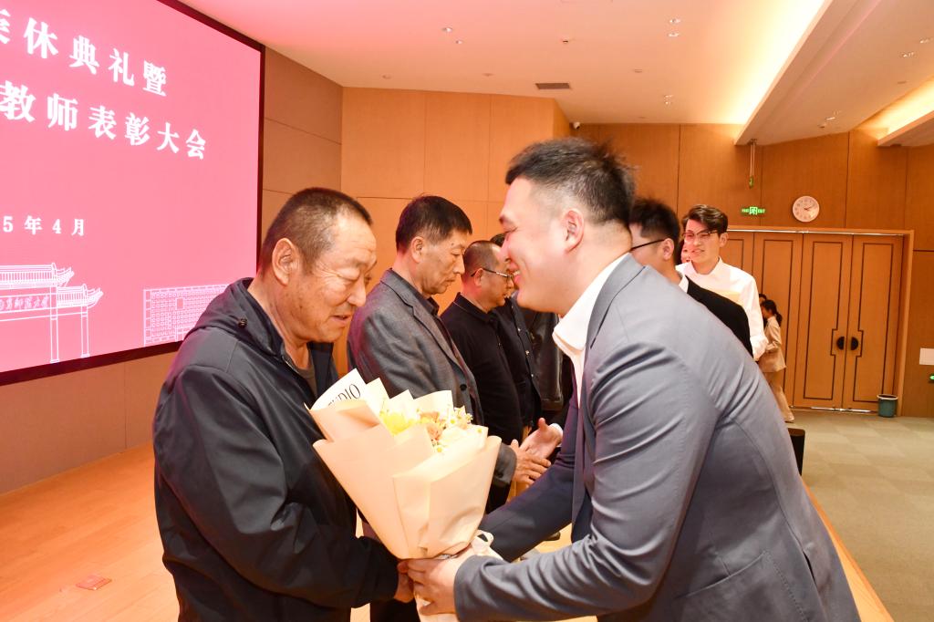 学校党委书记邢光在曲阜校区为荣休教师代表颁发荣誉证书和师道之印