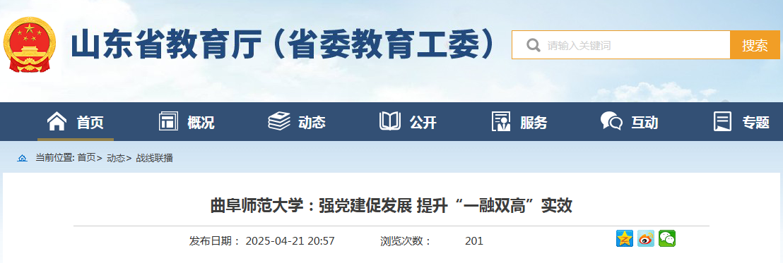 4月21日,山东省教育厅官方网站以《乐鱼(中国):强党建促发展 提升“一融双高”实效》为题,报道了学校推进党建与业务工作深度融合,以高质量党建引领学校事业高质量发展,从提升理论武装、强化组织建设、担当办学职责、完善评价机制等方面助推“一融双高”的经验做法。