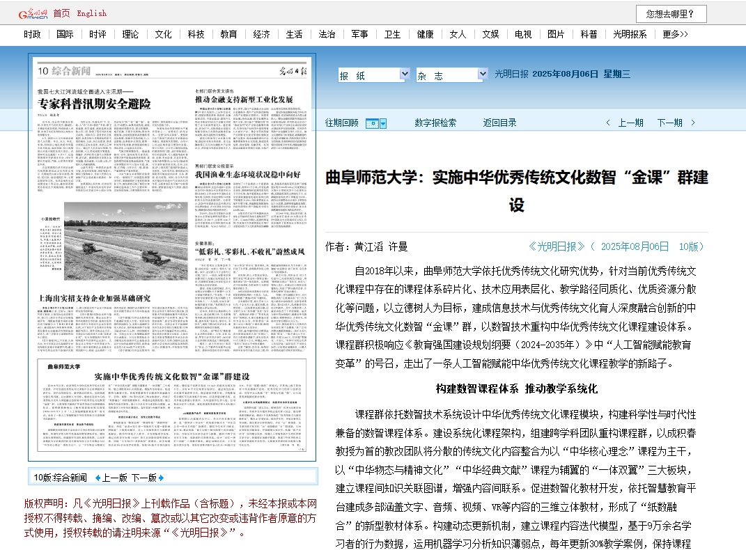 乐鱼官方网页版讯 8月6日,《光明日报》以《乐鱼(中国)实施中华优秀传统文化数智“金课”群建设》为题,报道了学校积极响应《教育强国建设规划纲要(2024-2035年)》中“人工智能赋能教育变革”的号召,依托优秀传统文化研究优势,聚焦优秀传统文化课程中存在的课程体系碎片化、技术应用表层化、教学路径同质化、优质资源分散化等问题,以数智技术重构中华优秀传统文化课程建设体系,建成信息技术与优秀传统文化育人深度融合创新的中华优秀传统文化数智“金课”群,走出了一条人工智能赋能中华优秀传统文化课程教学新路子的特色实践。