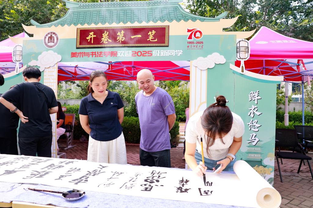 书法学院延续“开学第一笔”的特色传统,以笔墨为媒,将文化仪式感融入迎新环节。新生们依次提笔,或用遒劲楷书、或用灵动行书、或用古朴隶书,在长卷上郑重写下自己的名字,一笔一划间,既是对书法艺术的初体验,也是对大学生活的美好开启。