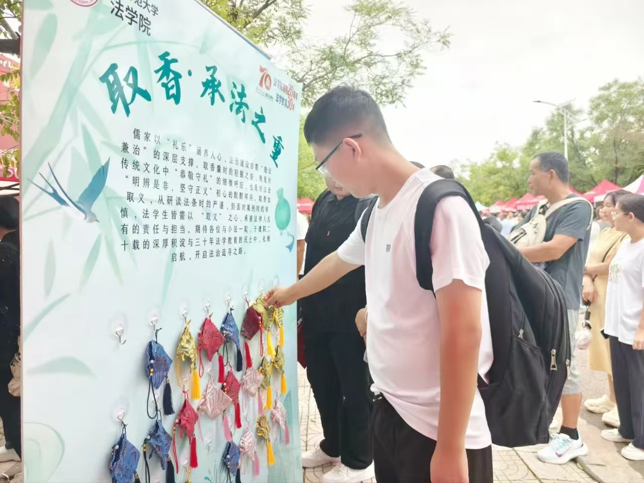 法学院迎新活动精彩且富有深意。以“香”为媒,独具特色的香囊制作活动让新生感受法学魅力,在取香、调香、留香中领悟法理精神。法官人形立牌成打卡热点,点燃了新生对法律职业的向往。