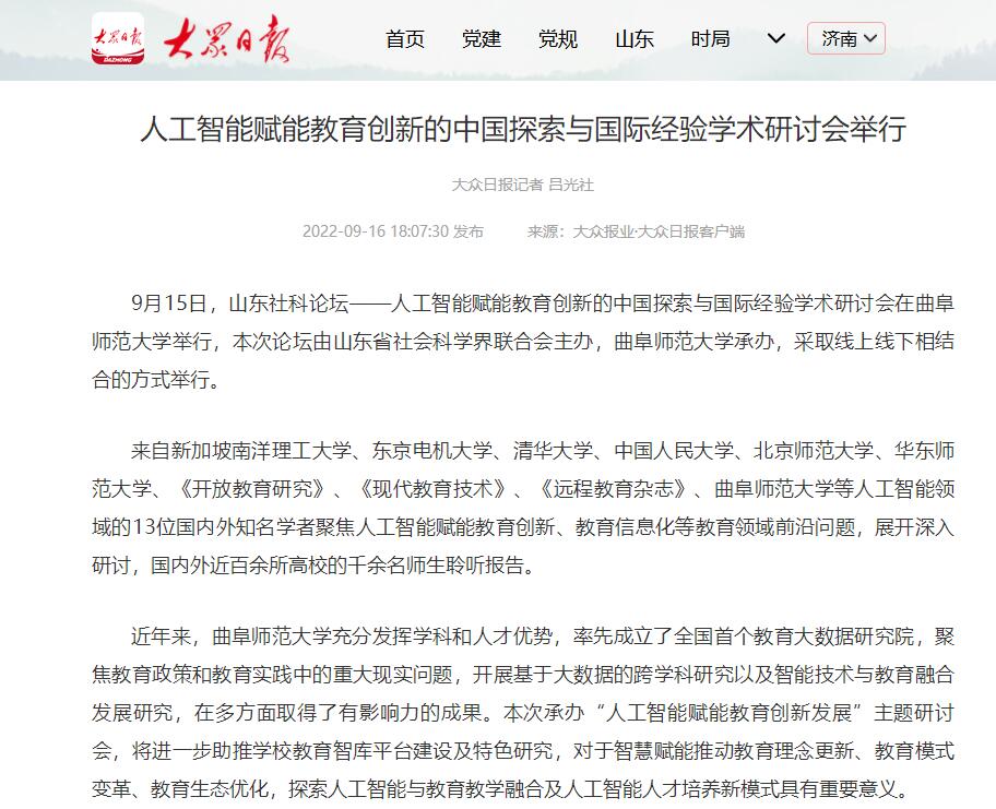 【大众日报】人工智能赋能教育创新的中国探索与国际经验学术研讨会在曲师大举行