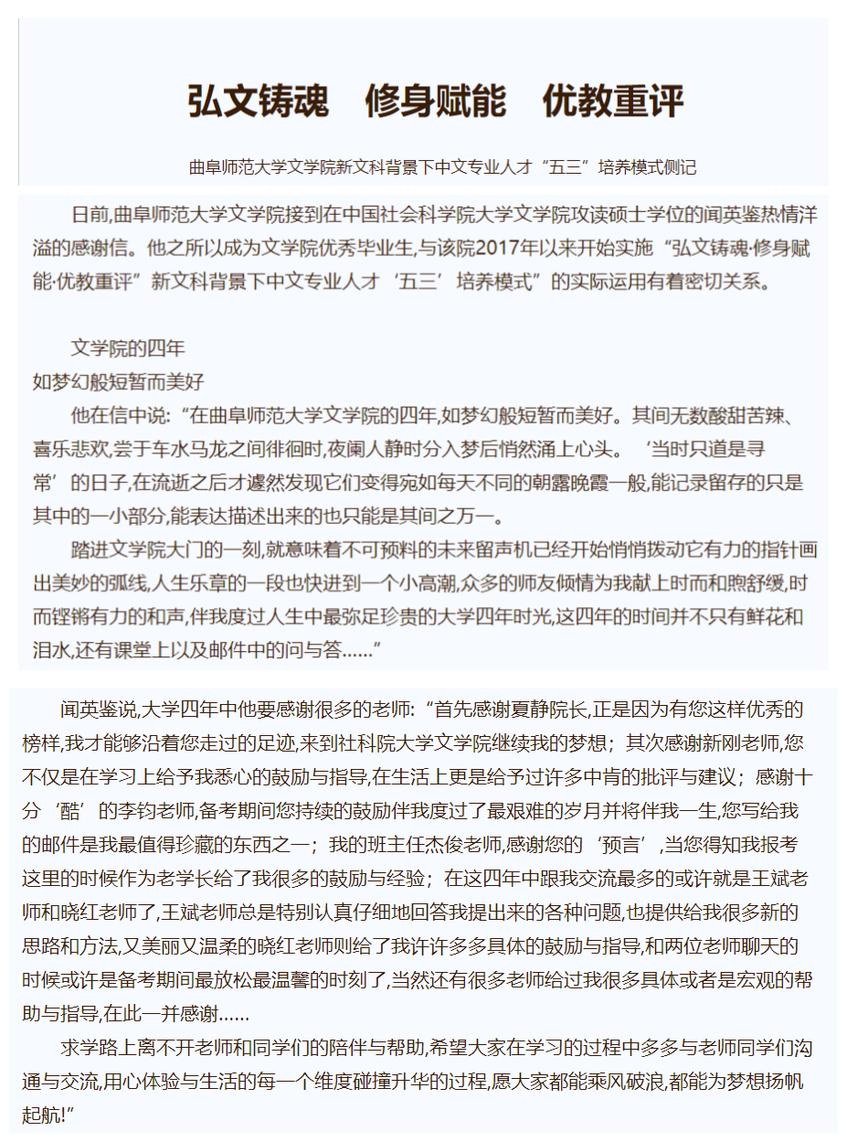 【齐鲁晚报】弘文铸魂 修身赋能 优教重评 ——乐鱼(中国)文学院新文科背景下中文专业人才“五三”培养模式侧记