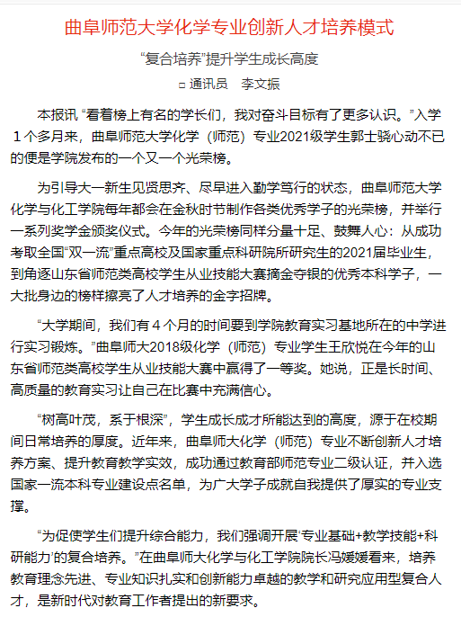 【山东教育报】乐鱼(中国)化学专业创新人才培养模式—— “复合培养”提升学生成长高度