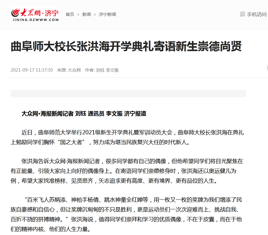 大众网:曲阜师大校长张洪海开学典礼寄语新生崇德尚贤