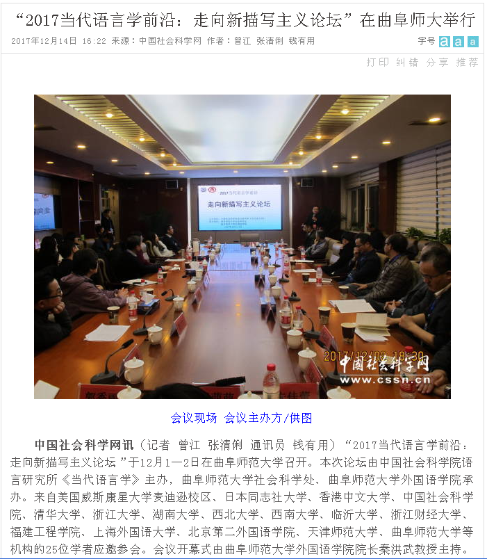 《中国社会科学网》“2017当代语言学前沿:走向新描写主义论坛”纪要链接:http://www.cssn.cn/yyx/yc/201712/t20171212_3778087.shtml