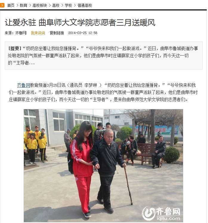 齐鲁网:让爱永驻 曲阜师大文学院志愿者三月送暖风