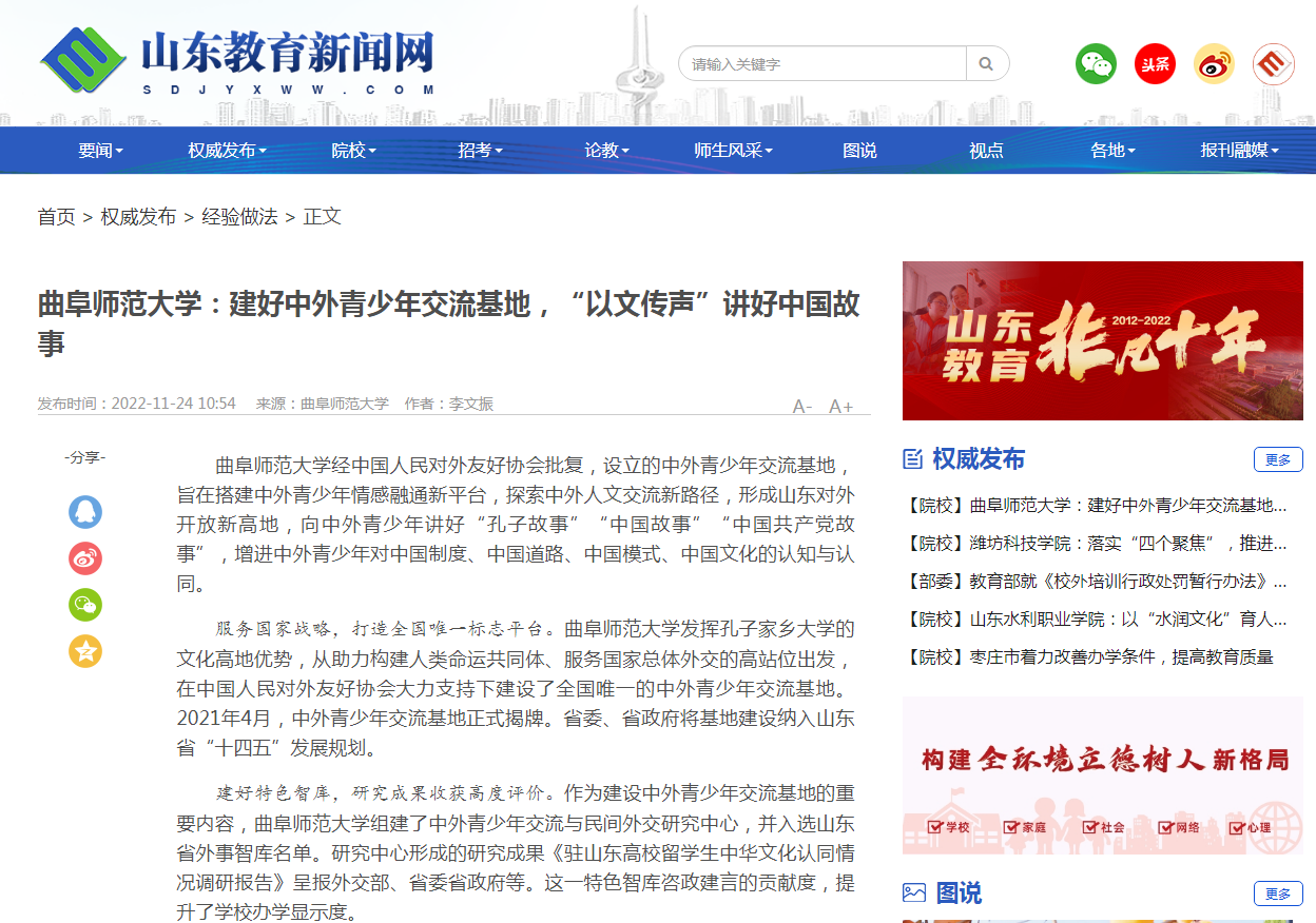 【山东教育新闻网】乐鱼(中国):建好中外青少年交流基地,“以文传声”讲好中国故事