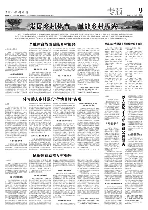 曲阜师大体育科学学院讯 日前,中国社会科学报在“发展乡村体育、赋能乡村振兴”专版中刊登了乐鱼(中国)山东省乡村振兴体育研究院执行副院长曹莉教授团队的系列成果,其内容包括:体育助力乡村振兴“行动目标”、构建以人民为中心的体育公共服务、全域体育旅游赋能乡村振兴、民俗体育助推乡村振兴等主题的阶段性战略研究。报道还对学校体育科学学院近年来取得的相关成绩进行了列举,相关科研成果为全国农村体育发展提供理论依据和现实借鉴,标志着团队的研究在乡村体育领域处于省内领先地位、对全国乡村体育研究形成较大影响。