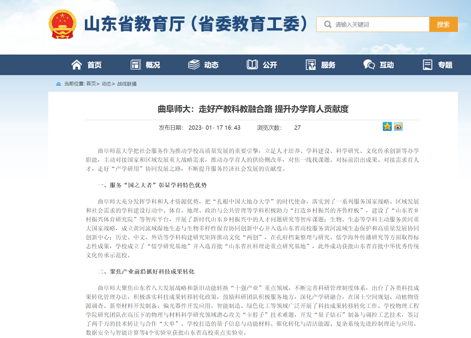 曲阜师大充分发挥学科和人才资源优势,把“扎根中国大地办大学”的时代使命,落实到了一系列服务国家战略、区域发展和社会需求的学科建设行动中。体育、地理、政治与公共管理等学科积极助力“打造乡村振兴的齐鲁样板”,建设了“山东省乡村振兴体育研究院”等智库平台,开展了新时代山东乡村振兴中的人才问题研究等智库课题;生物、生态等学科主动服务黄河重大国家战略,成立黄河流域湿地生态与生物多样性保育协同创新中心并入选山东省高校服务黄河流域生态保护和高质量发展协同创新中心;历史、中文、外语等学科构建研究矩阵推动文化“两创”,在孔府档案整理与研究、儒学海外传播研究等方面取得标志性成果,学校成立了“儒学研究基地”并入选首批“山东省社科理论重点研究基地”,此外成功获批山东省首批中华优秀传统文化传承示范校。