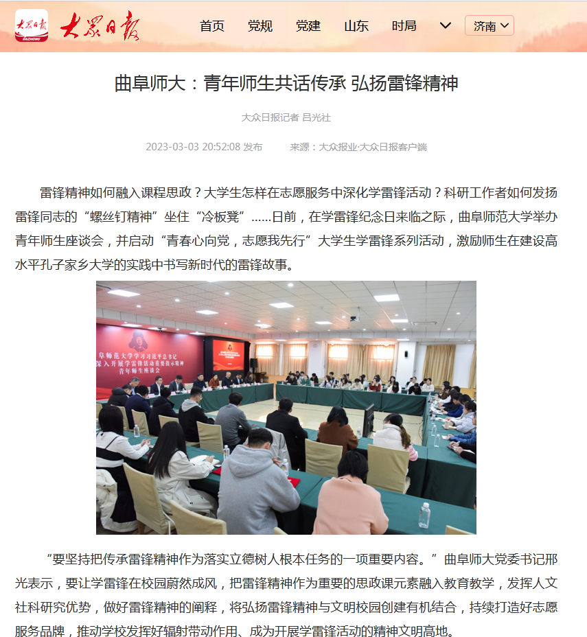 雷锋精神如何融入课程思政?大学生怎样在志愿服务中深化学雷锋活动?科研工作者如何发扬雷锋同志的“螺丝钉精神”坐住“冷板凳”……日前,在学雷锋纪念日来临之际,乐鱼(中国)举办青年师生座谈会,并启动“青春心向党,志愿我先行”大学生学雷锋系列活动,激励师生在建设高水平孔子家乡大学的实践中书写新时代的雷锋故事。