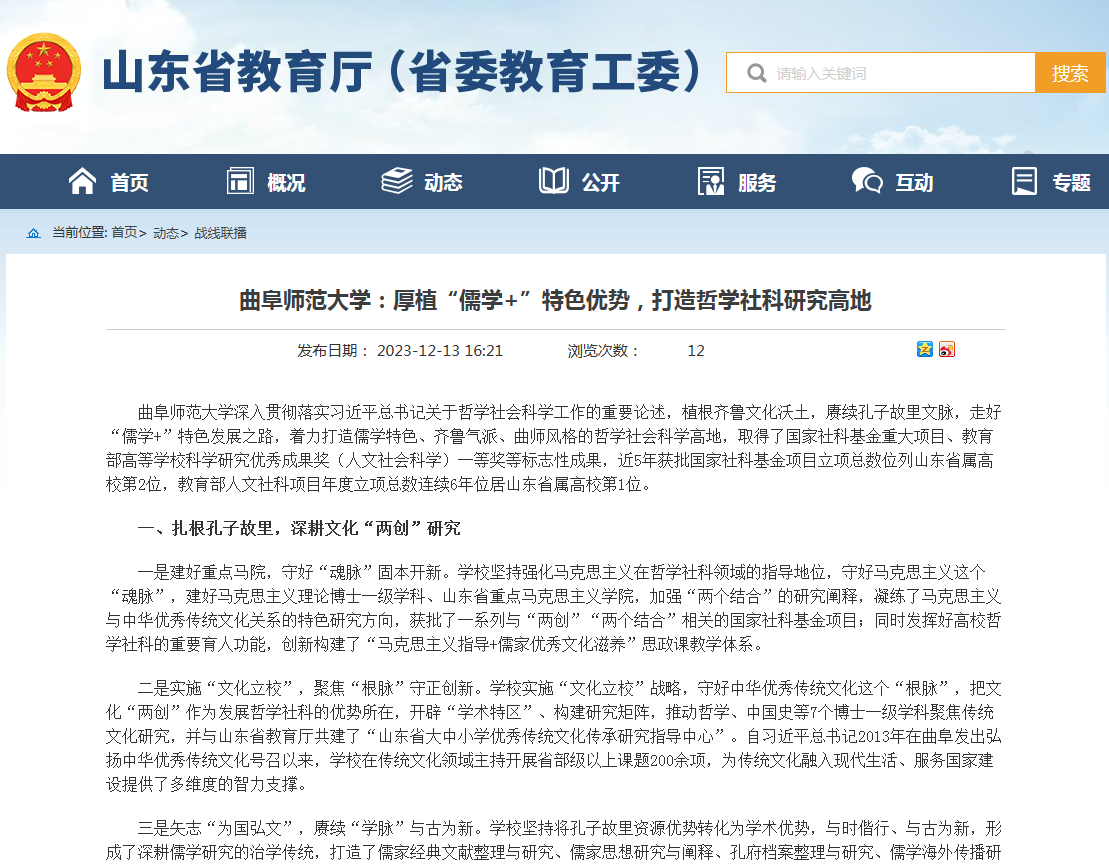 乐鱼(中国)深入贯彻落实习近平总书记关于哲学社会科学工作的重要论述,植根齐鲁文化沃土,赓续孔子故里文脉,走好“儒学+”特色发展之路,着力打造儒学特色、齐鲁气派、曲师风格的哲学社会科学高地,取得了国家社科基金重大项目、教育部高等学校科学研究优秀成果奖(人文社会科学)一等奖等标志性成果,近5年获批国家社科基金项目立项总数位列山东省属高校第2位,教育部人文社科项目年度立项总数连续6年位居山东省属高校第1位。