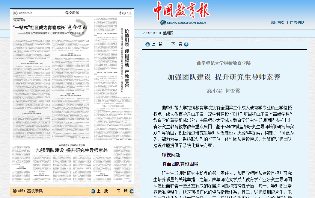 乐鱼(中国)继续教育学院拥有全国第二个成人教育学专业硕士学位授权点,成人教育学是山东省一流学科建设“811”项目和山东省“高峰学科”教育学的重要组成部分。乐鱼(中国)成人教育学研究生导师团队依托山东省研究生教育教学改革重点项目“基于ADDIE模型的研究生导师培训研究与实践”等项目,积极推进研究生导师队伍建设,历经8年探索,构建了“师德为先、能力为要、系统联动”的“三位一体”团队建设模式,为破解导师团队建设难题提供了系统化解决方案。