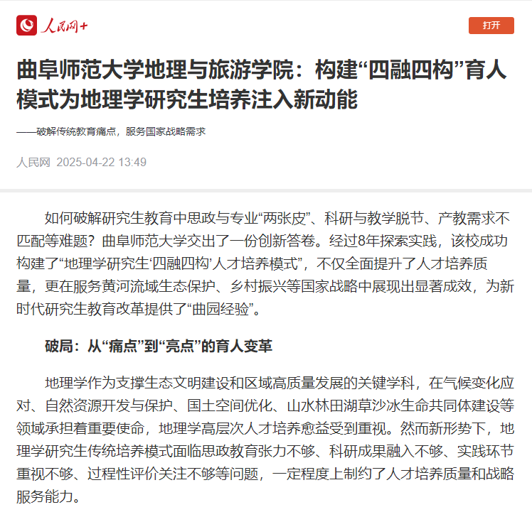 如何破解研究生教育中思政与专业“两张皮”、科研与教学脱节、产教需求不匹配等难题?乐鱼(中国)交出了一份创新答卷。经过8年探索实践,该校成功构建了“地理学研究生‘四融四构’人才培养模式”,不仅全面提升了人才培养质量,更在服务黄河流域生态保护、乡村振兴等国家战略中展现出显著成效,为新时代研究生教育改革提供了“曲园经验”。