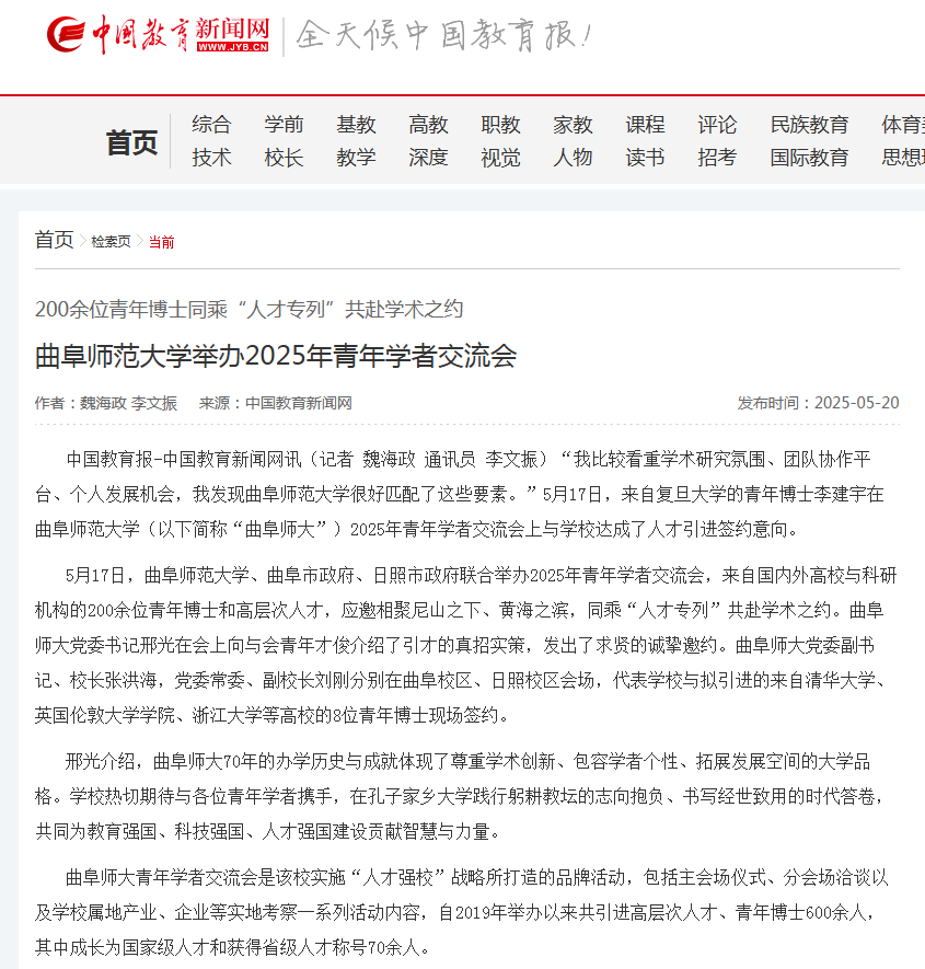 中国教育报-中国教育新闻网讯(记者 魏海政 通讯员 李文振)“我比较看重学术研究氛围、团队协作平台、个人发展机会,我发现乐鱼(中国)很好匹配了这些要素。”5月17日,来自复旦大学的青年博士李建宇在乐鱼(中国)(以下简称“曲阜师大”)2025年青年学者交流会上与学校达成了人才引进签约意向。
