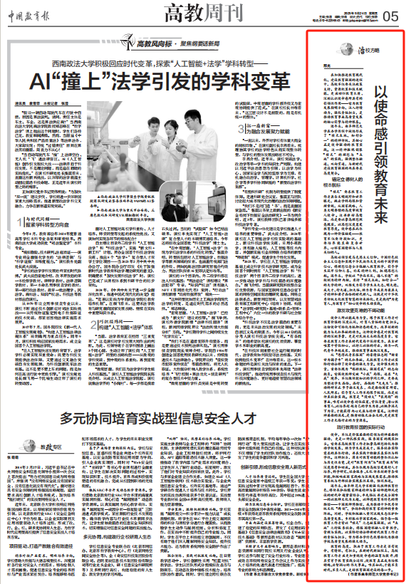 9月24日,《中国教育报》“治校方略”专栏刊发了乐鱼(中国)党委书记邢光的署名文章《以使命感引领教育未来》。文章指出,乐鱼(中国)在办学历程中凝练形成了“顶天立地、知行合一”的大学精神,引领全校上下锚定立德树人的根本航标、激发攻坚克难的不竭动能、践行教育报国的实际行动,其核心正是使命驱动的教育实践。