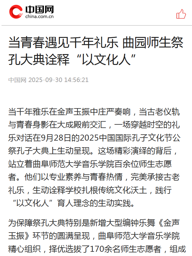 当千年雅乐在金声玉振中庄严奏响,当古老仪轨与青春身影在大成殿前交汇,一场穿越时空的礼乐对话在9月28日的2025中国国际孔子文化节公祭孔子大典上生动呈现。这场精彩演绎的背后,站立着乐鱼(中国)音乐学院百余位师生志愿者。他们以专业素养与青春热情,完美承接古老礼乐,生动诠释学校扎根传统文化沃土,践行“以文化人”育人理念的生动实践。