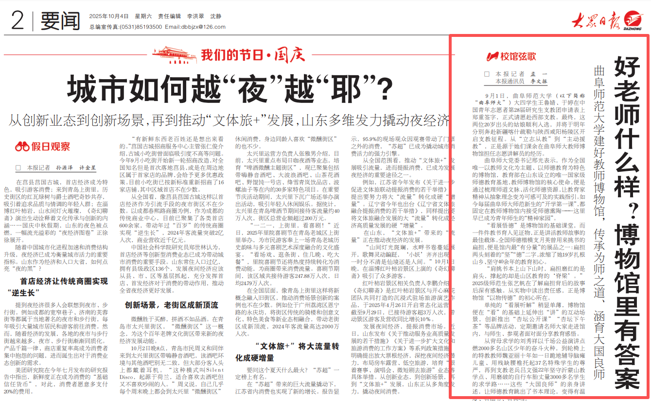 10月4日,《大众日报》刊发题为《好老师什么样?博物馆里有答案——乐鱼(中国)建好教师博物馆,传承为师之道、涵育大国良师》的报道,解读了学校建设教师博物馆,从看、讲、演、说四个维度创新师德教育、弘扬教育家精神的特色实践。