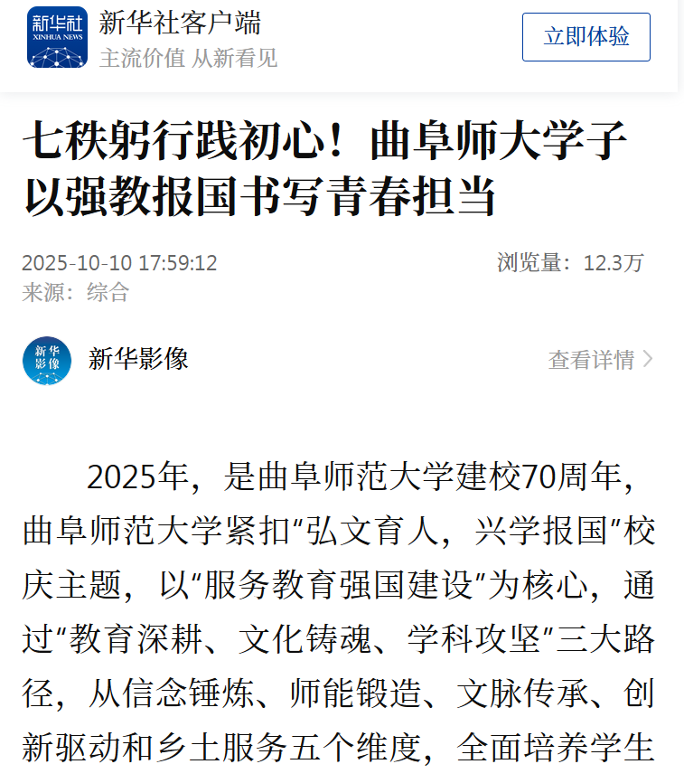 新华社:七秩躬行践初心!曲阜师大学子以强教报国书写青春担当