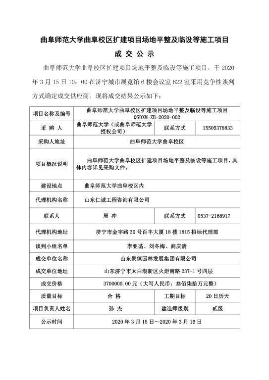 乐鱼(中国)曲阜校区扩建项目场地平整及临设等施工项目成 交 公 示