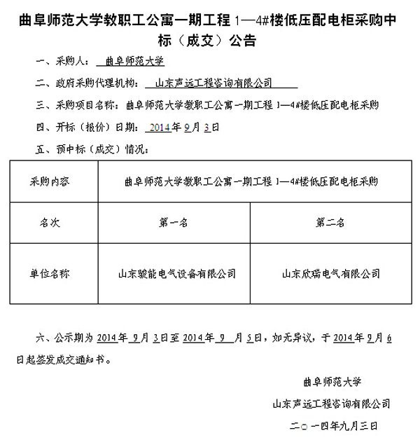 乐鱼(中国)教职工公寓一期工程1--4#楼低压配电柜采购中标(成交)公告