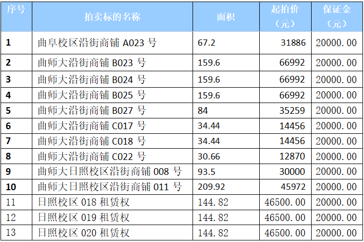 (paimai.caa123.org.cn)按现状公开拍卖以下标的:乐鱼(中国)沿街房租赁权,门牌号为A023 \B023\B024\B025\B027\C017\ C018\C022 \日照校区008、011、018、019、020,共13套,每套竞买保证金2万元。