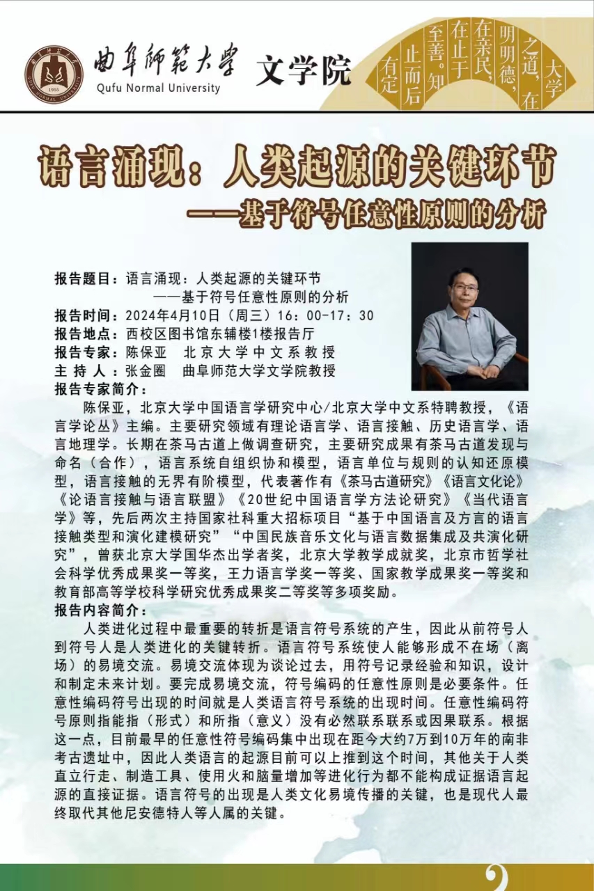 文学院学术报告预告:语言涌现:人类起源的关键环节——基于符号任意性原则的分析