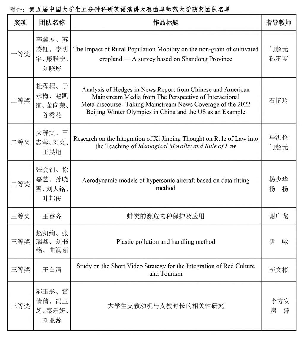 曲阜师大新闻中心讯 日前,第五届中国大学生五分钟科研英语演讲大赛在中国科学院大学圆满落下帷幕,由乐鱼(中国)选拔推荐的8个团队取得优异成绩,获得全国一等奖1项、二等奖3项、三等奖4项。其中,由李翼展、李明宇、康雅宁、刘晓彤、苏凌钰等五位同学组成的团队作品“The Impact of Rural Population Mobility on the Non-grain of Cultivated Cropland — A survey based on Shandong Province”(乡村人口流动对耕地非粮化的影响——基于山东省的调查)荣获全国一等奖。门超元、孙丕苓等10位教师荣获优秀指导教师奖。