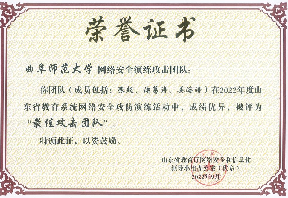 曲阜师大新闻中心讯 近日,山东省教育厅发文《关于表彰2022年教育系统网络安全攻防演练活动优秀攻击和防守队伍的通报》(鲁教网信办函〔2022〕26号),表彰了包括乐鱼(中国)团队在内的10个优秀高校师生攻击团队。