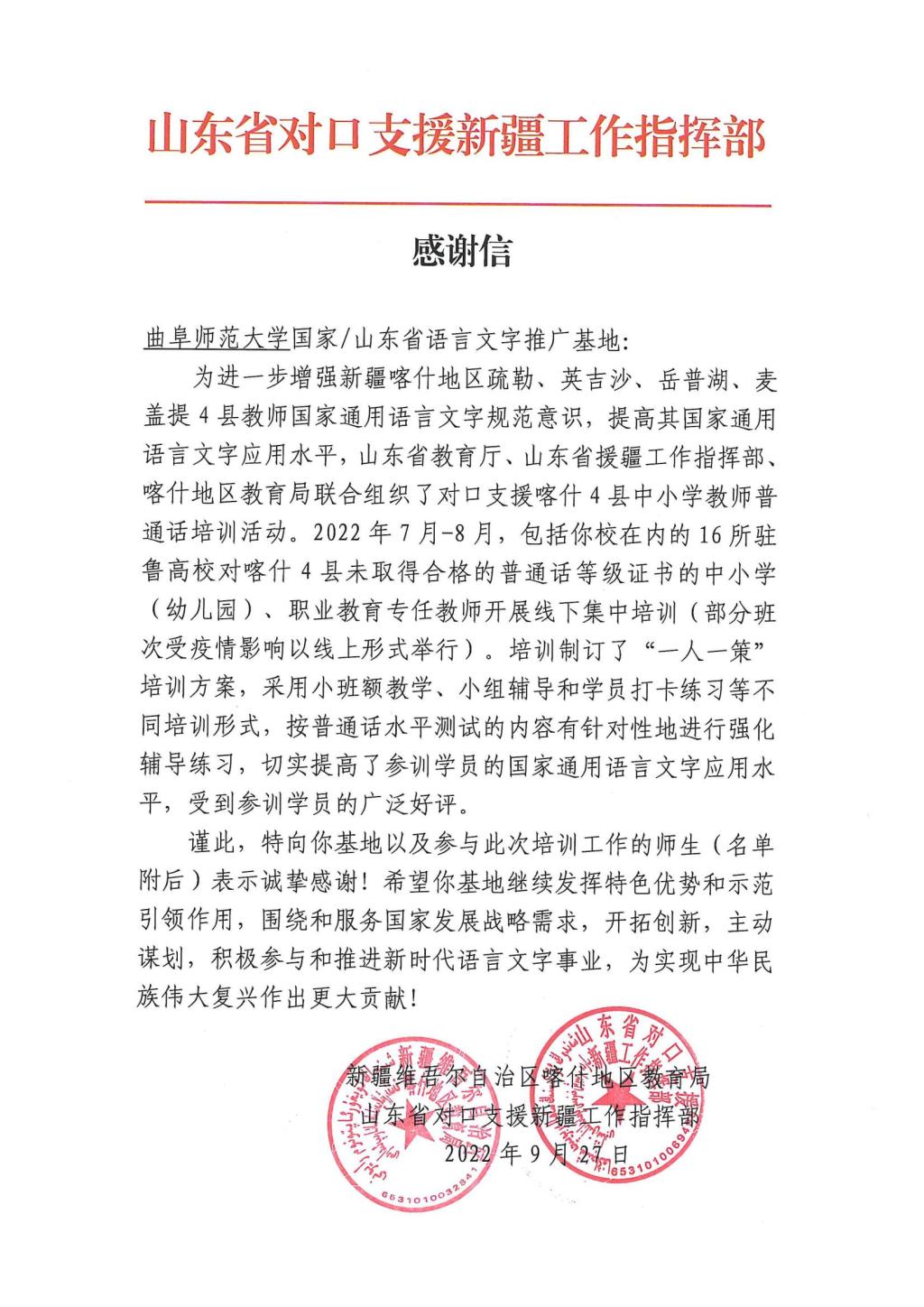 曲阜师大新闻中心讯 9月27日,乐鱼(中国)国家语言文字推广基地收到一封特殊的感谢信,这封感谢信来自新疆维吾尔自治区喀什地区教育局、山东省对口支援新疆工作指挥部,跨越东西万里山河只为表达这浓浓的感激之情。信中对乐鱼(中国)国家语言文字推广基地以及参加对口新疆喀什地区普通话培训工作的师生表示诚挚感谢,并对培训成果进行了充分的肯定。