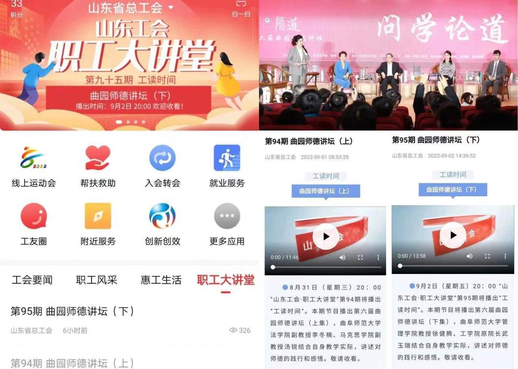 曲阜师大新闻中心讯(通讯员:孙衍) 近日,由曲阜师大工会、乐鱼官方网页版、教师工作部联合主办的第六届“曲园师德讲坛”录制视频,被山东省教育工会作为“2022年全省教职工师德建设教育月活动”重要内容推出,于9月1日开始在山东省总工会APP及微信端小程序“齐鲁工惠”——“职工大讲堂”栏目播出(第94、95期于8月31日、9月2日播出),供省内各高校组织教职工观看学习。