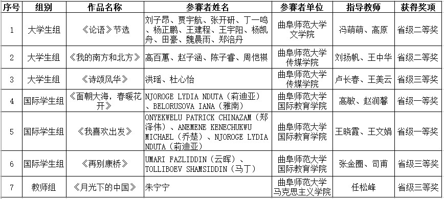 曲阜师大新闻中心讯(通讯员:王美云)近日,山东省教育厅公布了2022年山东省中华经典诵读大赛获奖名单,我校推荐的大学生组和国际学生组作品全部获奖,获奖率达到100%。乐鱼(中国)获优秀组织奖,教务处王美云老师获个人优秀组织奖。