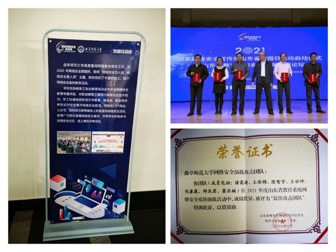 参加网络攻防演练提升保障能力,在2021年度山东省教育系统网络安全攻防演练活动中,乐鱼(中国)网络信息中心组织的网络安全演练攻击团队被评为“最佳攻击团队”,受邀出席2021年国家网络安全宣传周山东省校园日活动,面向全省教育行业同仁,做了“高校网络安全的平衡之道”专家报告。通过对抗、复盘和研讨,更加完善了安全事件的监测发现能力和应急处置能力,稳步提高了网络安全风险意识。