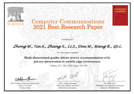 曲阜师大新闻中心讯(通讯员:毕文波) 近日,计算机通讯领域知名国际期刊《Computer Communications》公布了一年一度的最佳研究论文奖。曲阜师大计算机学院2018级硕士研究生仲伟艺为第一作者(通讯作者为齐连永)的论文《Multi-dimensional Quality-driven Service Recommendation with Privacy-preservation in Mobile Edge Environment》从该期刊去年发表的600余篇论文中脱颖而出,荣获2021年度唯一一篇“最佳研究论文奖”(2021 Best Research Paper Award)。
