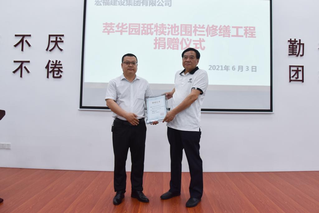 仪式上,冯冲为宏福建设集团有限公司颁发捐赠证书。