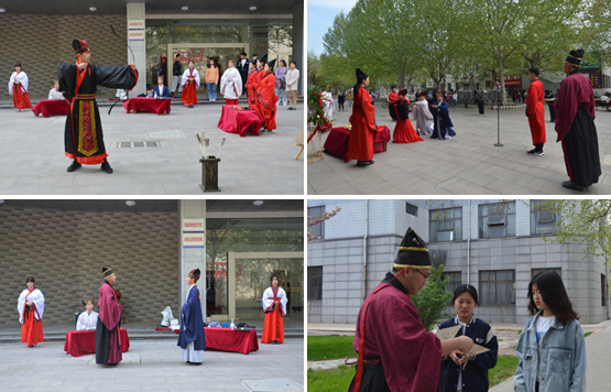 活动期间,历史文化学院传统礼仪队进行的射礼和祭孔礼的展演活动,吸引了师生驻足观看。本次射礼展演的是平时燕息之日举行的射礼,礼仪队成员们以古人为模范进行献宾、射箭,生动地表达了相互辞让的中华优秀品质,展现了华夏特有的人文体育精神。祭孔礼环节中,礼仪队成员身着汉服进行展演,礼仪有节,行止有度,揖让有法,心怀敬意地向同学们充分展示了古代祭孔仪式,拉近了同学们与传统礼仪文化的距离。