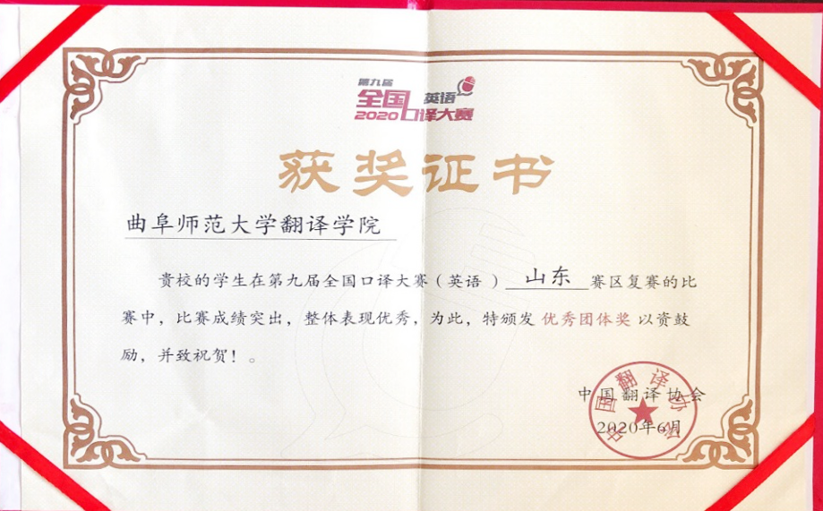 全国口译大赛(英语)由中国外文局指导、中国翻译协会主办,旨在促进翻译学科建设和语言服务行业的繁荣与发展、培养高素质语言服务人才,更好地服务国家发展大局和国际传播能力建设,是最具影响力的全国性口译赛事之一。本届大区赛采用网络形式进行,共有来自9个省的200多名选手同台竞技。比赛采用交替传译形式,分为英译汉和汉译英两个环节,赛题涉及政治、经济、科技、艺术等多个领域,对选手的基本口译能力、知识广度和应变能力进行了全面考察。最终,翻译学院学子凭借扎实的双语能力和良好的心理素质一路过关斩将从山东赛区复赛脱颖而出,顺利完成大区赛。翻译学院也荣获优秀组织奖和优秀团体奖。