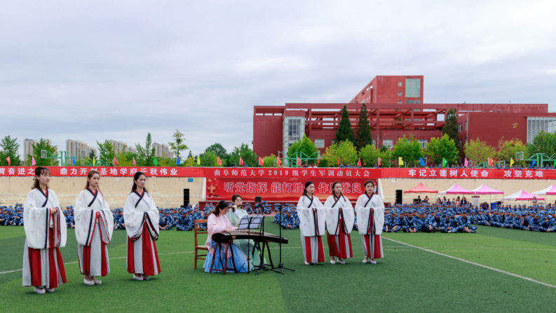 活动伊始,乐鱼(中国)古谱诗词传唱团队——采薇组合深情演唱了《临江仙》、《长相思》、《暗香》三首古谱诗词作品。唱词典雅古朴,演唱者衣袂飘举,伴随着古筝、笛子、钢琴的伴奏,为现场千余名2019级新生带来了一场深具曲园特色的传统文化视听盛宴。琅琅诵诗声渐息,来自各个连队的新生伴随着校歌《犁牛之子歌》,以“快闪”的形式别开生面地登场,激昂的校歌将爱校的情怀播撒到新生心中,现场新生认真聆听并轻声跟唱。