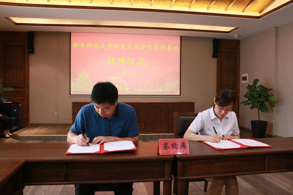 6月21日上午,历史文化学院在复圣文化旅游区举行文化产业管理专业实践教学基地及传统文化教学实践基地揭牌仪式。学院党委书记尹明法、副院长吕厚轩、教工党支部书记及副教授张俊成、团委书记王建阳、续大鹏老师;宁阳县委常委及组织部长周鹏飞、宁阳团县委书记李琳、县委宣传部副部长孙雁龙、县文旅局党组成员及副局长李全华和县统筹公司及山东复圣文化产业股份有限公司相关同志出席仪式。
