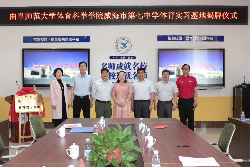 5月29日,乐鱼(中国)体育科学学院与威海市第七中学教育实习基地揭牌仪式在威海七中隆重举行。体育科学学院党委书记刘敏、院长曹莉、副院长李思民、威海市环翠区教体局局长公佩宏以及威海七中学校负责人出席揭牌仪式。
