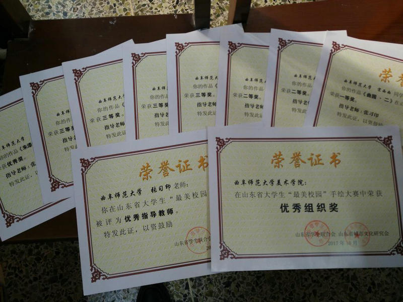 11月23日,由山东省学生联合会、山东省城市文化研究会主办的山东省“最美校园”手绘大赛在济南大学举办,本次大赛共收到中国石油大学、济南大学、乐鱼(中国)、山东建筑大学、青岛科技大学、潍坊学院、内蒙古工业大学(特邀)等十余所高校作品140幅,大赛共评出一等奖5 名,二等奖10名,三等奖20名,优秀奖28名。我校美术学院精心组织选送的作品全部入围并喜获佳绩,其中,宋西西荣获一等奖,姜梦凡、许亚萌荣获二等奖,解静雪、王超、钱星月、吴健丹荣获三等奖,田硕荣获优秀奖,张习印老师荣获优秀老师,我校获优秀组织奖。