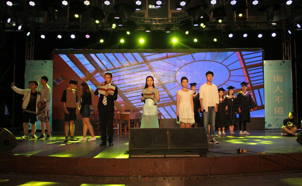热情洋溢的啦啦操表演拉开了晚会序幕。歌曲串烧、幽默捧腹的相声、舞蹈以及独具特色的情景剧,让整场晚会在欢笑和感动中上演。毕业生林蕊带来《多想对你说》唱出对曲园诉不完的衷情,说不完的离愁;王捷老师以《一杯美酒》送给大家一份特殊的毕业礼物,唱出对毕业生前途的美好祝愿,悠扬的歌声赢得台下掌声阵阵;刘振坤、刘硕带来相声《学哑语》,引来师生笑声不断;形式新颖的《如果我们不曾相遇》,以情景剧和诗朗诵的形式,表达了对母校的留恋、对大学生活的不舍;个人独舞《后青春期的诗》、刚柔并济的群舞《鱼戏》,用优美舞姿舞出对毕业生的真诚祝福、对曲园的赞颂。最后,毕业生代表的歌曲大串烧,用歌声定义了属于他们独一无二的青春,引发台上台下一起合唱,场面再掀高潮。