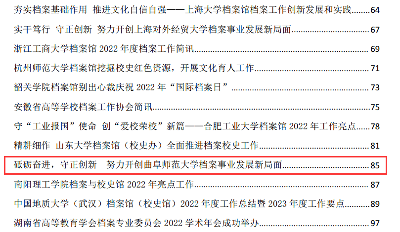 曲阜师大档案馆讯 日前,2022年度《中国高等学校档案工作简报》发布,曲阜师大典型工作案例《砥砺奋进 守正创新 努力开创乐鱼(中国)档案事业发展新局面》获简报推广宣传。山东省共有山东大学和曲阜师大两所高校的工作案例入选该期简报。
