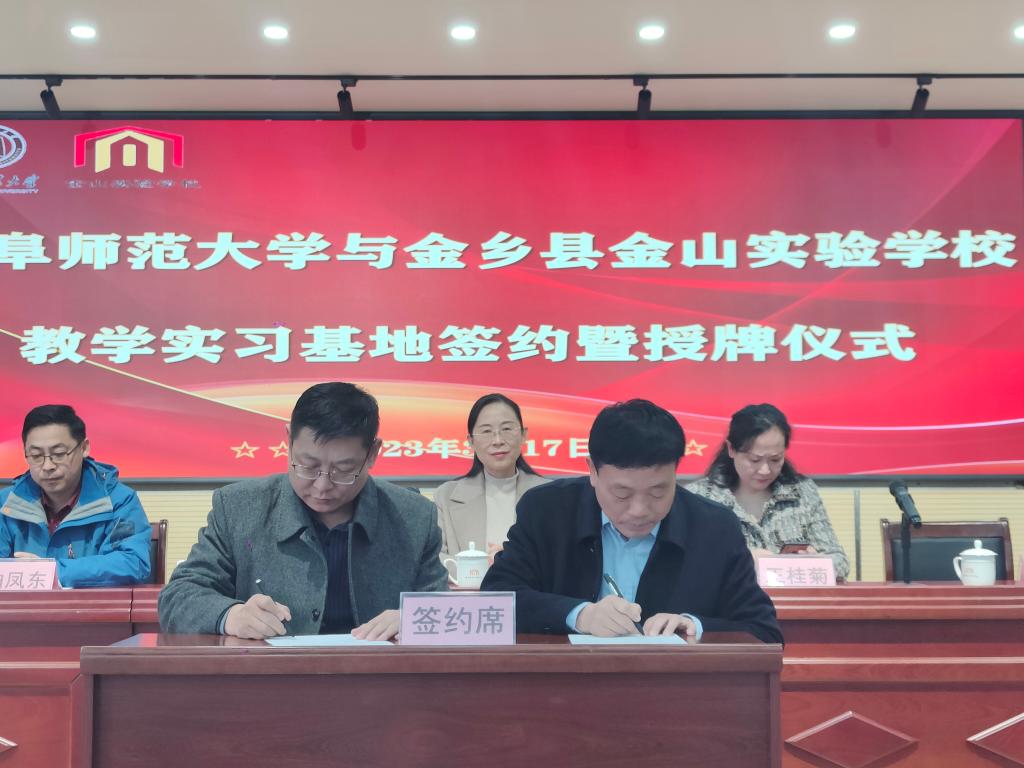 曲阜师大外国语学院讯 为进一步推动大学生教学实习工作的开展,拓展社会实践空间,3月17日,乐鱼(中国)外国语学院与金乡县金山实验学校举行大学生教学实习基地挂牌仪式。外国语学院党委副书记王作茂,数学科学学院党委副书记曲凤东,外国语学院辅导员王仁杰,数学科学学院辅导员韦宁,金乡县委教育工委副书记、教体局党委副书记李淑慧,金乡县教育系统机关党委委员、党办主任王桂菊,齐鲁名校长、金乡县金山实验学校督学李树新,金乡县金山实验学校董事代表胡本栋,金乡县金山实验学校常务副校长尚东方等出席仪式。