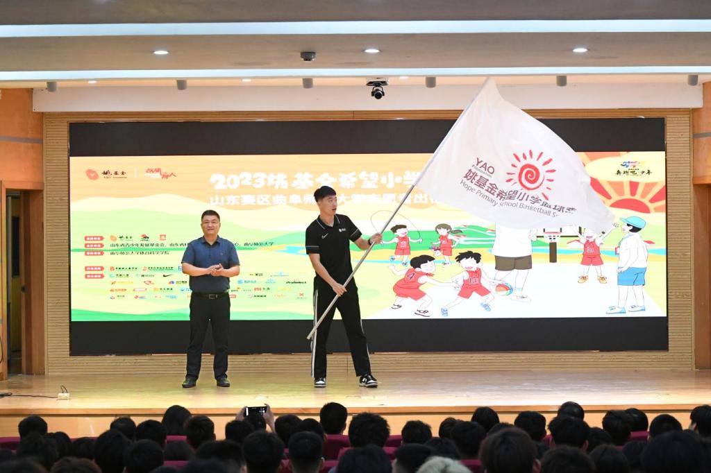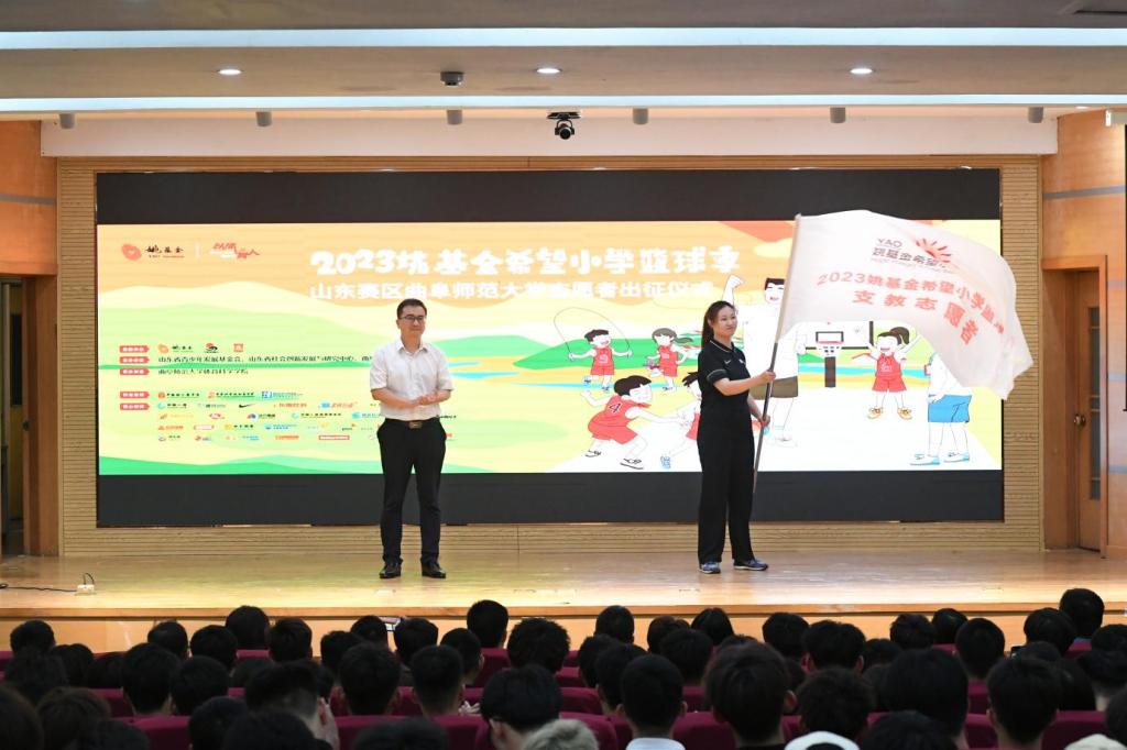 山东省青少年发展基金会资助部部长董晓峰为志愿者代表李柯阳授姚基金希望小学篮球季旗,乐鱼(中国)团委书记孔轶众为志愿者代表马蔓妮授姚基金希望小学篮球季支教志愿者旗。