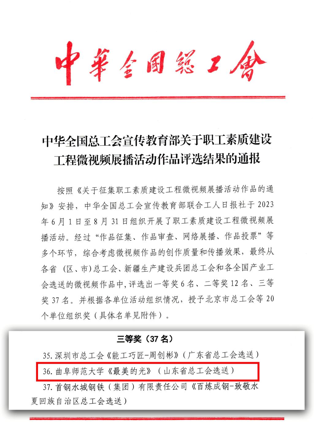 曲阜师大图书馆讯 近日,中华全国总工会宣传教育部发布了关于职工素质建设工程微视频展播活动作品评选结果的通知,由图书馆代表学校工会推送的微视频作品《最美的光》荣获三等奖,也是山东省总工会唯一上榜作品。
