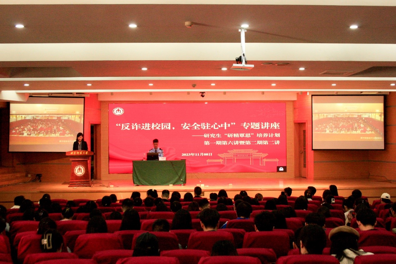 曲阜师大研究生处讯 为提高研究生反诈防骗意识,增强自我保护能力,我校于11月8日举办 “反诈进校园,安全驻心中”专题讲座活动——研究生“研精覃思”培养计划第一期第六讲暨第二期第二讲,特邀利津县公安局利津派出所刘东岳警官开展反诈专题讲座。研究生处副处长黄美玲主持活动,我校研究生“研精覃思”培养计划全体学员及各培养单位研究生参加活动。