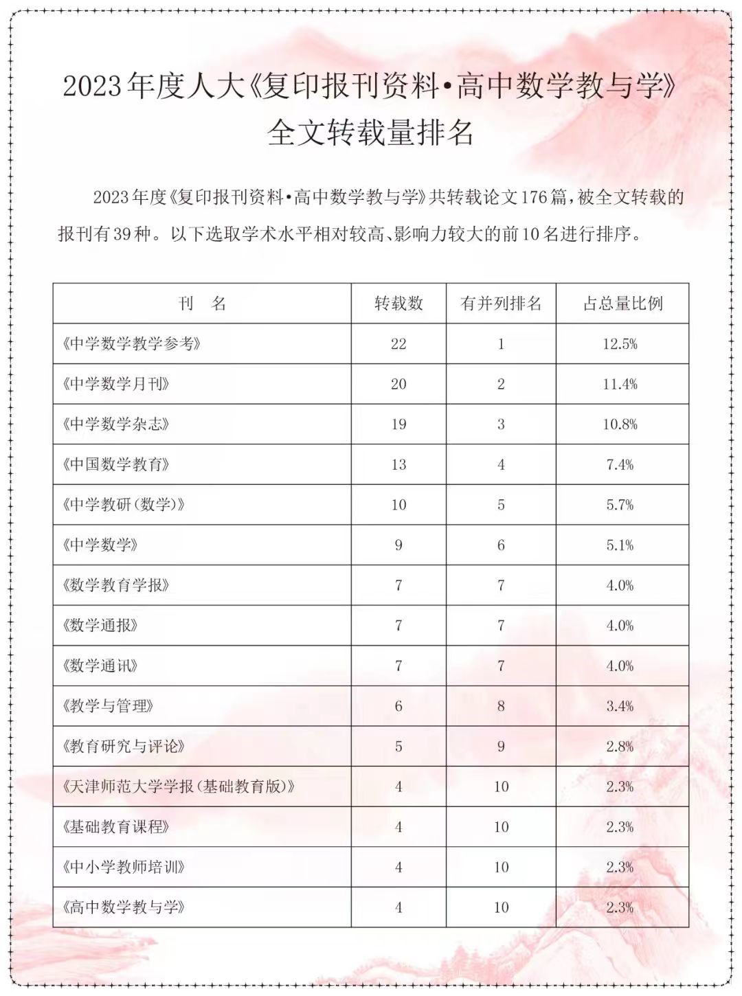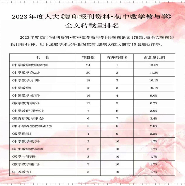 曲阜师大《中学数学杂志》讯 近日,根据中国人民大学书报资料中心全文数据库检索情况,乐鱼(中国)《中学数学杂志》被《复印报刊资料》系列刊(2023年度)全文转载的文章39篇。《复印报刊资料·初中数学教与学》共转载论文178篇,被全文转载的报刊有43种,《中学数学杂志》(初中版)被转载20篇,占总量的11.2%,第2名;《复印报刊资料·高中数学教与学》共转载论文176篇,被全文转载的报刊有39种,《中学数学杂志》(高中版)被转载19篇,占总量的10.8%,排名第3;全年总转载数39篇,第2名;杂志全年总发文数184篇,被转载比全国同类期刊第1。